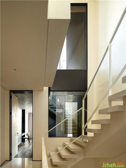 樓梯間從一層到三層縱向打通,套景手法也同步貫徹。兩個獨立的空間彼此延伸,規(guī)整和諧。三層則略顯外凸,交錯的體塊與嚴謹?shù)呐浔?,進一步彰顯著細膩的處理。