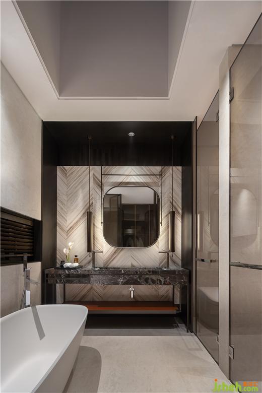 主衛(wèi)頂部設(shè)有天窗,借助光線變化塑造著微妙動態(tài),并讓這一隅實現(xiàn)室內(nèi)外的交融與對話。此外,鏡面的尺度、位置、造型,乃至圓弧的邊角處理,無一不凝聚著設(shè)計師對功能與美學(xué)的融匯捕捉。