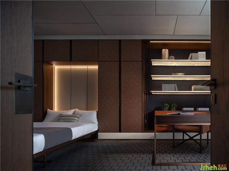 晚輩房套間以色調(diào)為觸點氤氳開靜謐安適氣息,又引入紋路、肌理的細(xì)膩呼應(yīng),常州天安別墅設(shè)計傳遞出克制的高級。懸浮柜體輔以內(nèi)嵌格架,并配與燈光烘托,豐富場景層級。
