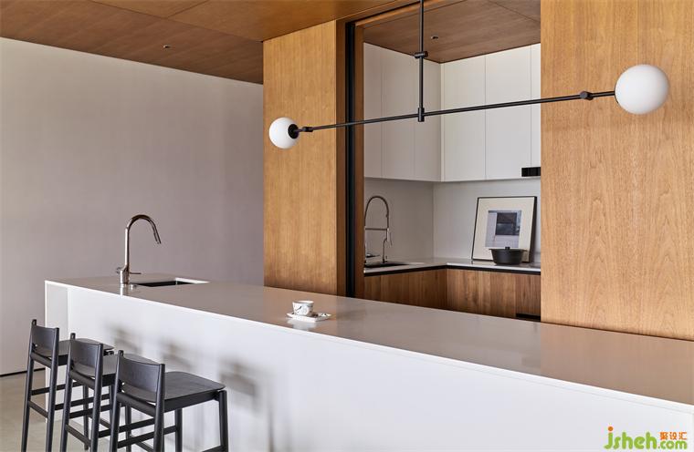 度假居所設(shè)計注重化零為整,廚房以BOX體塊構(gòu)筑溫馨場域,既整合了空間關(guān)系,又預(yù)設(shè)充足的收納功用,在選材和處理手法上則遵循壹舍團隊一貫的克制平衡之道。