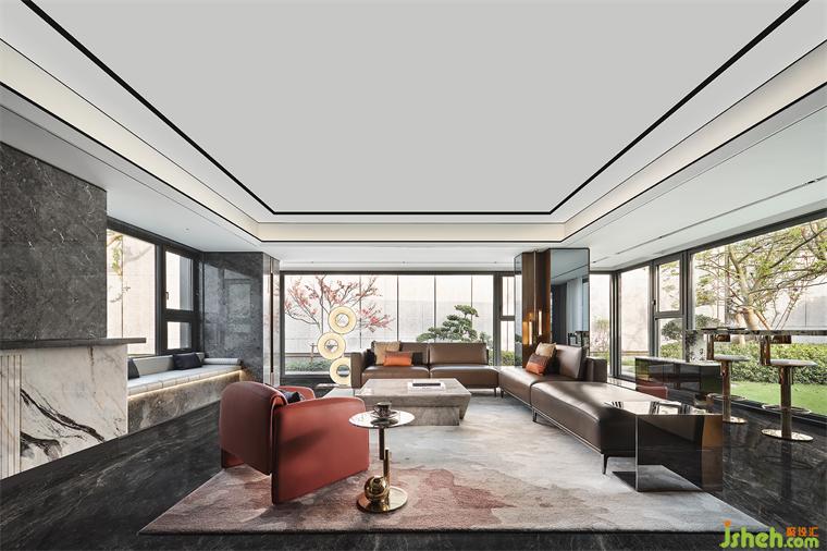 客廳采用三面落地窗,引戶外自然風光入室相伴,也賦予光影與質(zhì)感的交融。原始建筑立柱覆以鏡面的處理手法,也在無形中擴容。樣板間設計師因勢規(guī)劃好每一方寸,臨窗兩側(cè)皆設有座席,進一步提升日常使用的匹配度以及奢享性。