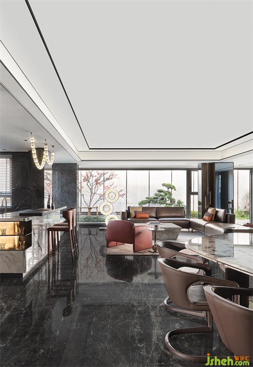 領先的LDKB一體化設計,將客、餐、廚、陽臺納入開放格局,樣板間設計合力打造出這頗為重要的“家庭會客中心”。于此融匯多種功能及場景,讓家不僅僅是生活的場所,也是社交陪伴的全能聚場。深灰石材與溫潤木飾的搭配,盡釋沉穩(wěn)高雅風尚。