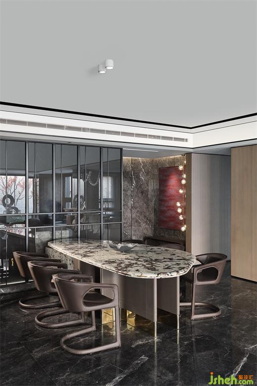 餐廳處的設計同樣利落從簡,一方石臺恰當?shù)慕?gòu)起與餐桌的起伏關系,在不斷延展的觸角之下,解碼更加立體多維的體驗,日常生活的閑適雅趣也于此盡情釋放。