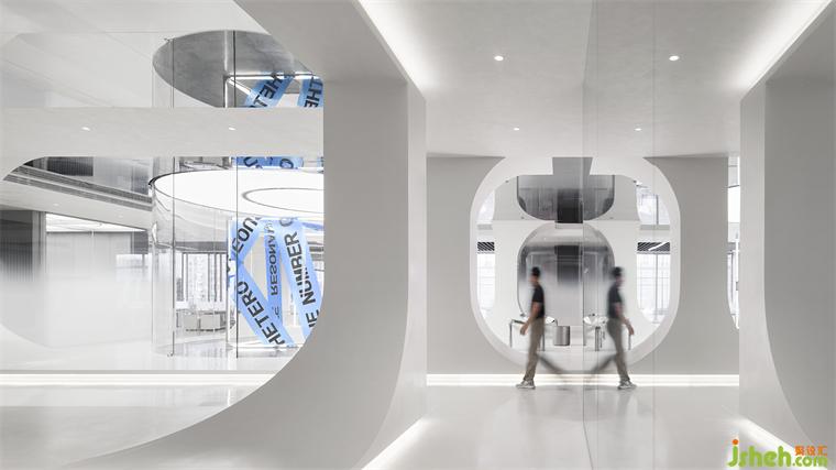辦公室設計師以洄游動線靈活銜接各功能分區(qū),通過玻璃帷幕圍合中庭,既能過濾外部嘈雜,又不影響采光。原有建筑柱體以鏡面不銹鋼覆蓋,或打造整排收納柜體,或以體塊穿插構建懸浮平臺,賦予多元功用與利落美學。
