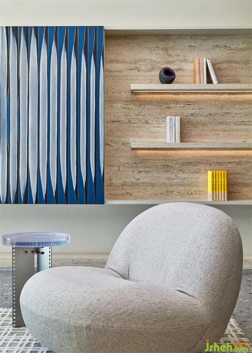 玄關(guān)原本窄小緊湊,由于左側(cè)墻體結(jié)構(gòu)限制不可變動(dòng),方磊于是從立面視覺(jué)來(lái)緩解,豪宅設(shè)計(jì)將入戶主背景進(jìn)行凹凸層次處理,主臥室的門也做了內(nèi)退調(diào)動(dòng),讓其在物理和感官上更顯松弛與寬余。