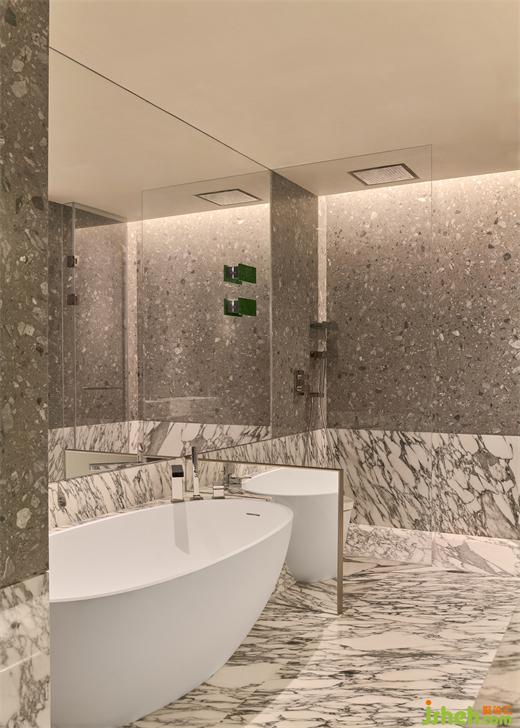 在難得的閑暇時(shí)光里,業(yè)主會(huì)泡在浴缸里休憩、看書。主衛(wèi)配備了多個(gè)鏡面,交疊映射,豪宅設(shè)計(jì)造就空間的無限延伸,現(xiàn)代性和未來感都得以強(qiáng)化。一個(gè)可旋轉(zhuǎn)的美妝柜,為女主人日常生活提供便捷。