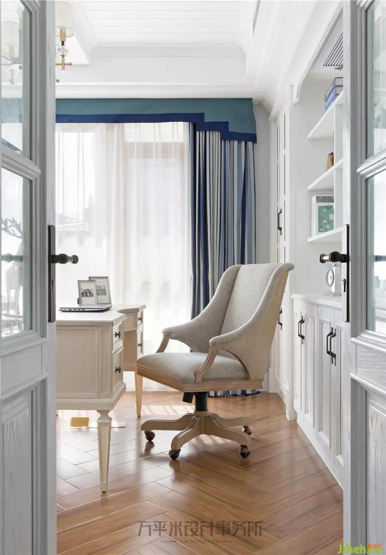 擺放淺木色布藝寬敞沙發(fā)主位,搭配可躺可坐的舒適功能單椅,相較開闊正式的客廳,明亮書房更宜成為一家人休閑上網、促膝交流或安靜共處的隨意自在空間。