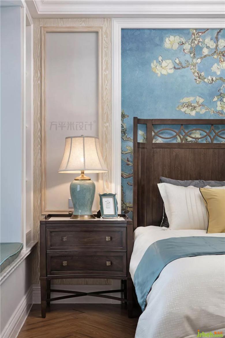 青藍(lán)色調(diào)的墻紙,窗簾,床品,裝飾畫作及臺(tái)燈擺件等色彩柔和自然過(guò)渡,品味不凡。