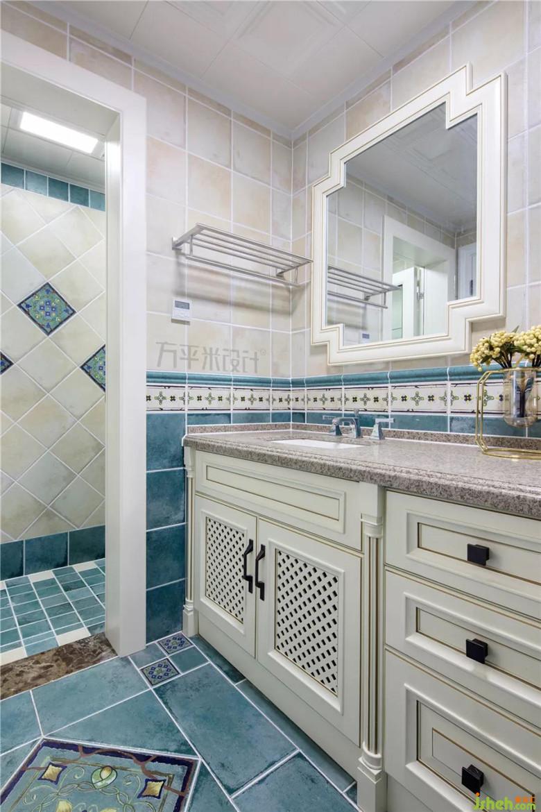 主衛(wèi)尺寸寬敞采取雙盆設(shè)計,分色仿古墻磚鋪貼,烘托原木定制浴室柜。