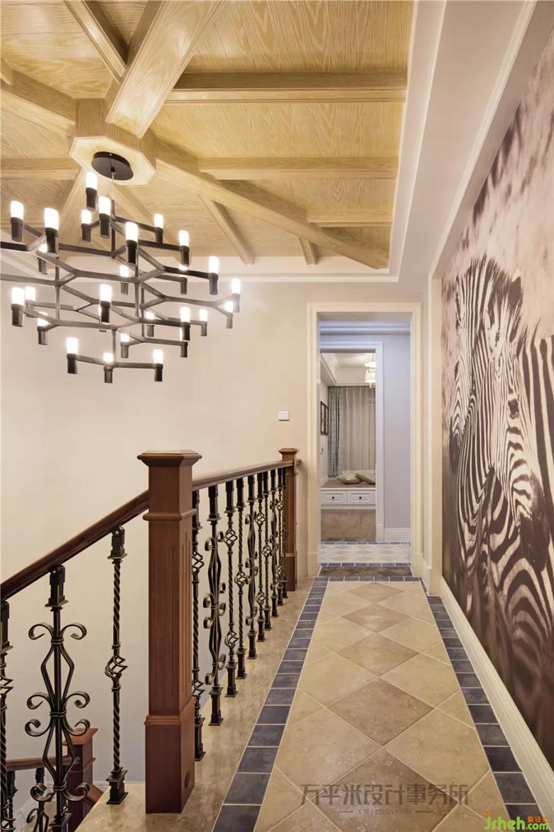 樓梯間頂部采用風(fēng)化白的原木色木質(zhì)吊頂,二樓通道處的滿墻黑白時尚噴繪,為年輕一輩的生活起居空間融入現(xiàn)代前衛(wèi)元素。