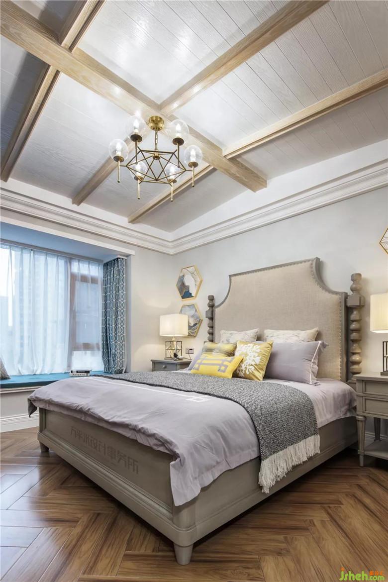 次臥為業(yè)主兒子的寬敞套間,因此在家具色彩上選用不同于主臥深咖色澤的淺灰色系,配以淺金與藍(lán)色調(diào)的布藝及裝飾品強調(diào)年輕活力感。
