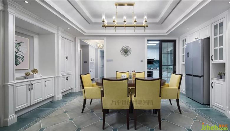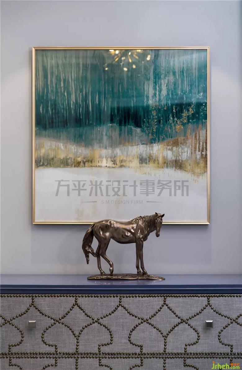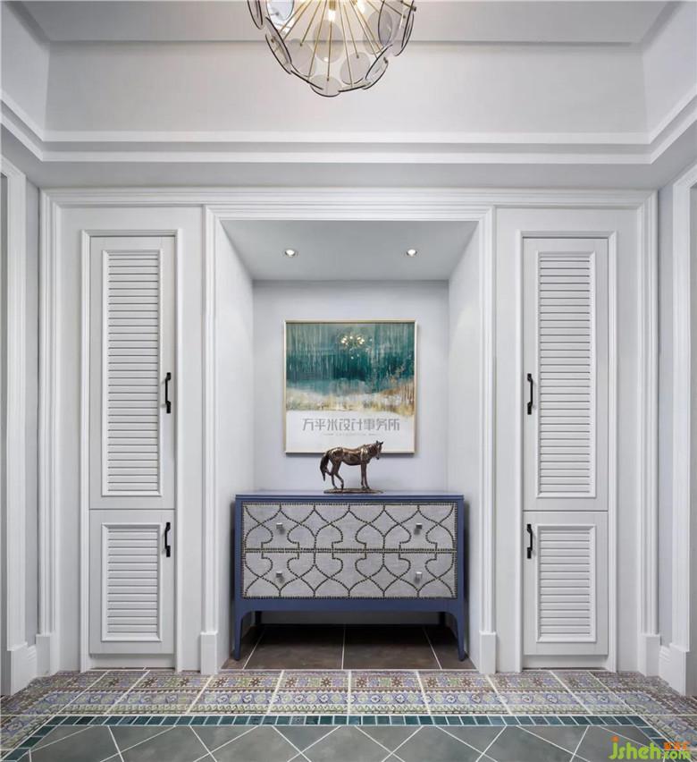 過道一側(cè)的墻面空間,依墻而設(shè)的滿墻儲(chǔ)物柜,考究比例分隔,以富有層次的典雅美式造型將中部留空,保留空間通透。