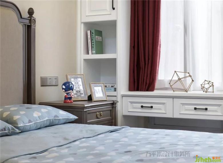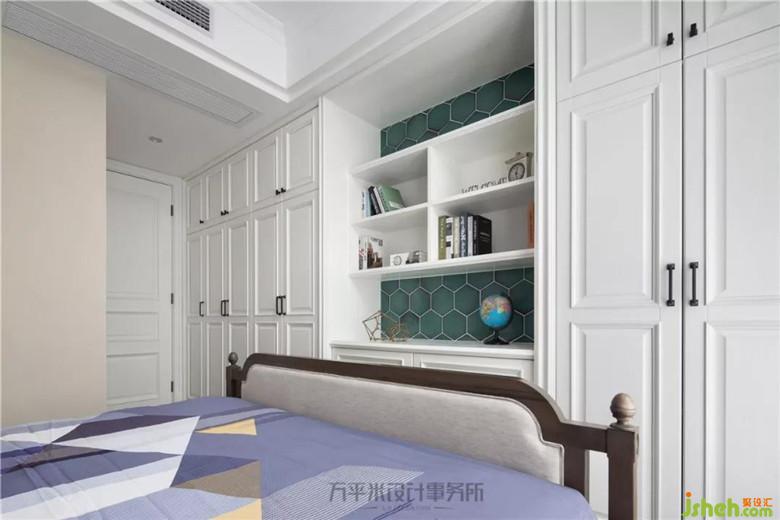 順應(yīng)房型特點(diǎn),于床尾一側(cè)設(shè)置滿墻儲(chǔ)物收納柜。