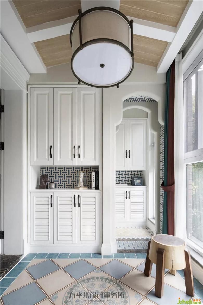 入戶門廳處制作坡面屋頂增添趣味。連續(xù)的造型門洞后左側(cè)是樓梯下空位置,作為未來規(guī)劃中寵物狗的小窩,現(xiàn)階段作為儲(chǔ)物間加以利用。內(nèi)嵌清玻的對(duì)開門把空間劃分,富有層次。輕柔陽光經(jīng)由挑空采光窗及南側(cè)景觀陽臺(tái)進(jìn)入屋內(nèi),使步入玄關(guān)后,即可感受大宅通透格局特有的開敞空間感。