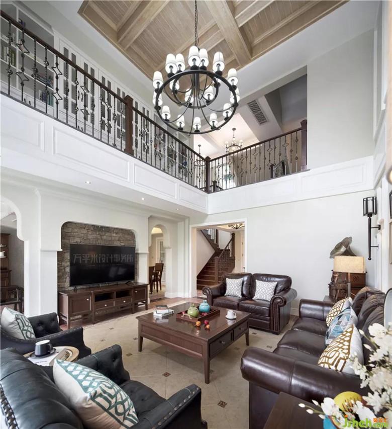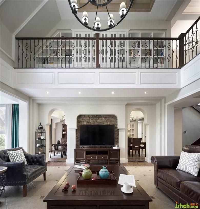 窗外繁茂園林綠植如畫作裝點(diǎn),跟隨步伐悄然進(jìn)入視野,令人心曠神怡。挑高的頂面極大程度的保留,二層的采光窗令空間明亮通透?;揖G色墻面作為全屋基調(diào)倍感輕柔,濃郁墨綠及暗橙窗簾色彩碰撞,高級(jí)而生動(dòng)。電視墻兩側(cè)對(duì)稱的雙弧形門洞富有異國風(fēng)情,粗獷石材裝飾墻面,天然純粹。浪漫的鏤空鐵藝扶梯流暢延伸至二樓增設(shè)的書柜展示區(qū),上下兩層組成風(fēng)格統(tǒng)一且美觀實(shí)用的功能立面??桃庾雠f的風(fēng)化白造型木梁于頂面交錯(cuò),巧妙隱藏原梁。木質(zhì)本色隨意輕松的豐富頂面,平衡底部厚重視覺。
