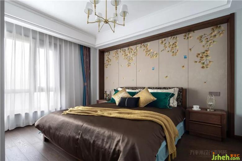 客臥選用內(nèi)嵌布質(zhì)硬包裝飾床頭。輕盈寫意的銀杏與蝶舞,生動(dòng)宜人。