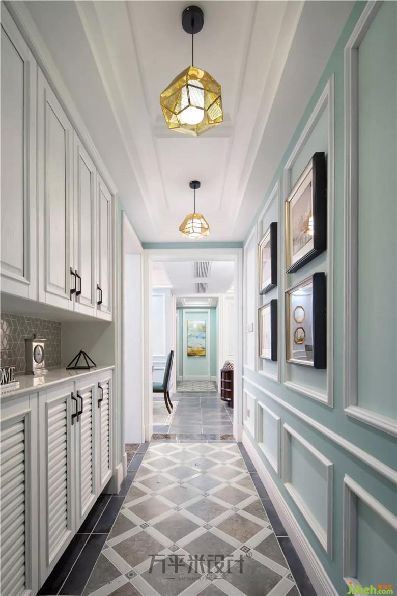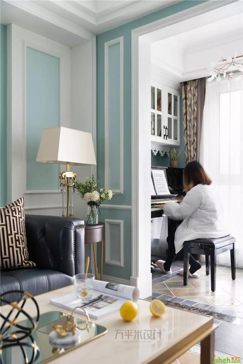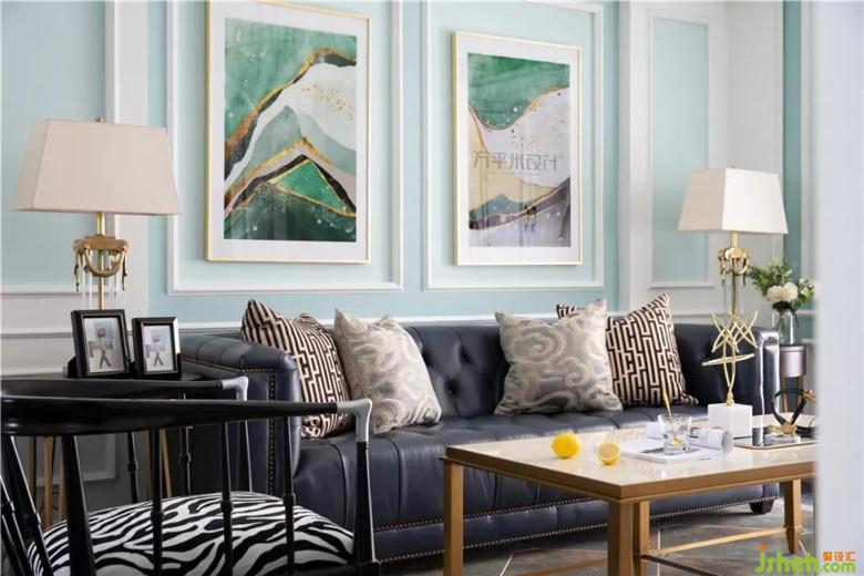 輕柔粉藍(lán)與薄荷綠墻面,純白木制勾勒,深淺漸進(jìn)將層次劃分,如海水微瀾,將淺淺波浪輕輕送抵海岸。安靜甜美的色彩語(yǔ)言,使歸家的心被溫柔撫慰,洗去一天忙碌的浮躁。精致黃銅元素,體量輕盈保持空間開(kāi)闊通透,金屬光澤傳遞特有高級(jí)質(zhì)感。四周深藍(lán)色地磚拼花與家具用色呼應(yīng),中心地毯區(qū)域大地色系增添溫暖感受。深藍(lán)定制沙發(fā),同色系沉穩(wěn)用色將重心壓低。而定制裝飾畫(huà)作恰如其分嵌入線框內(nèi)。于畫(huà)面色彩及比例分隔均呼應(yīng)全屋。