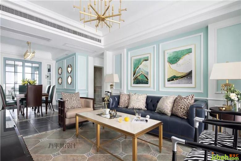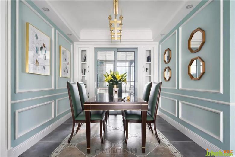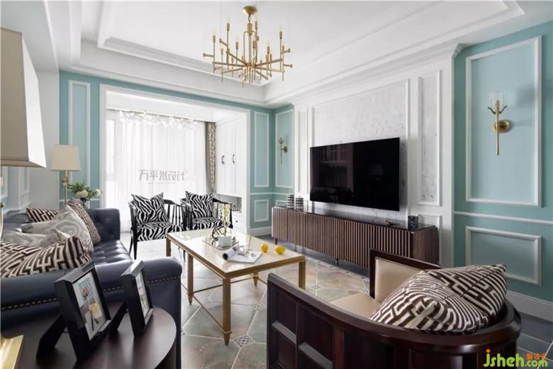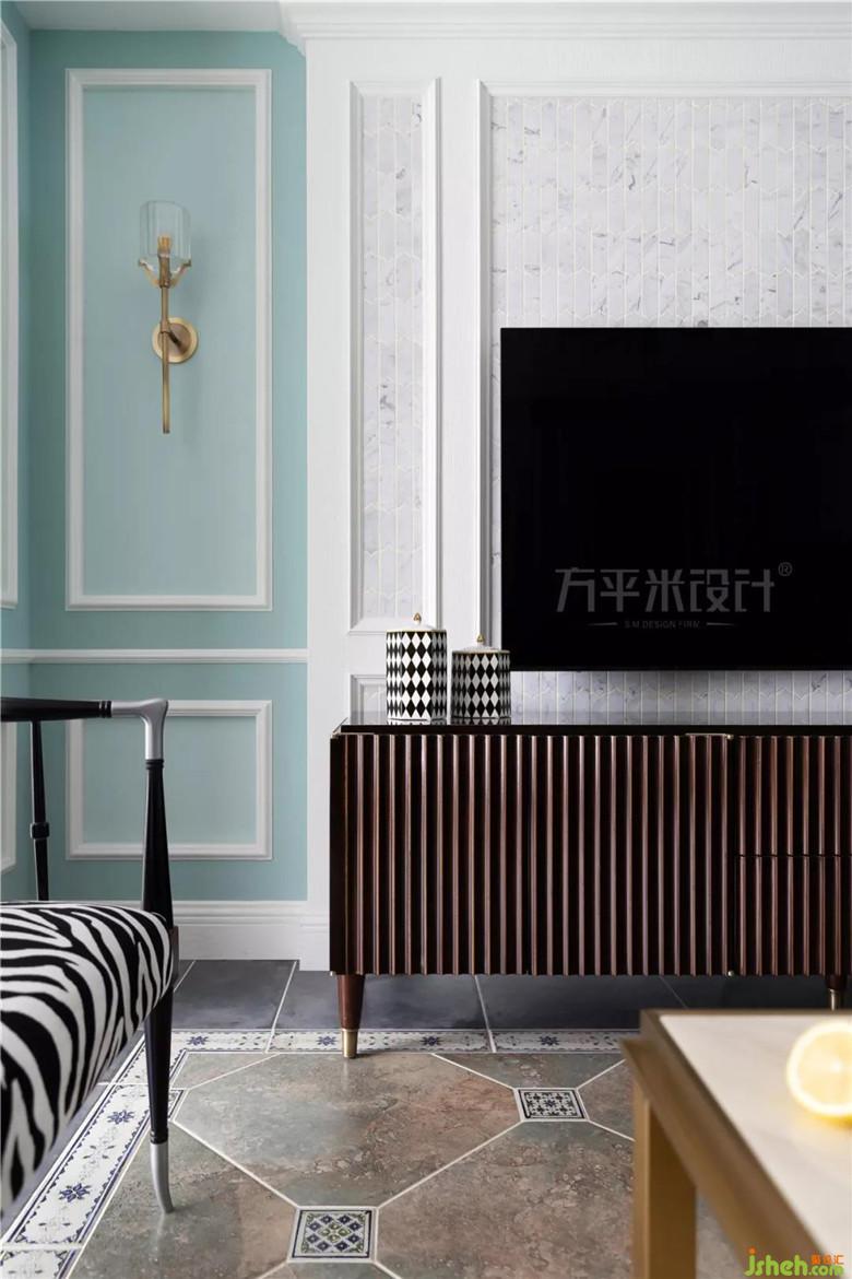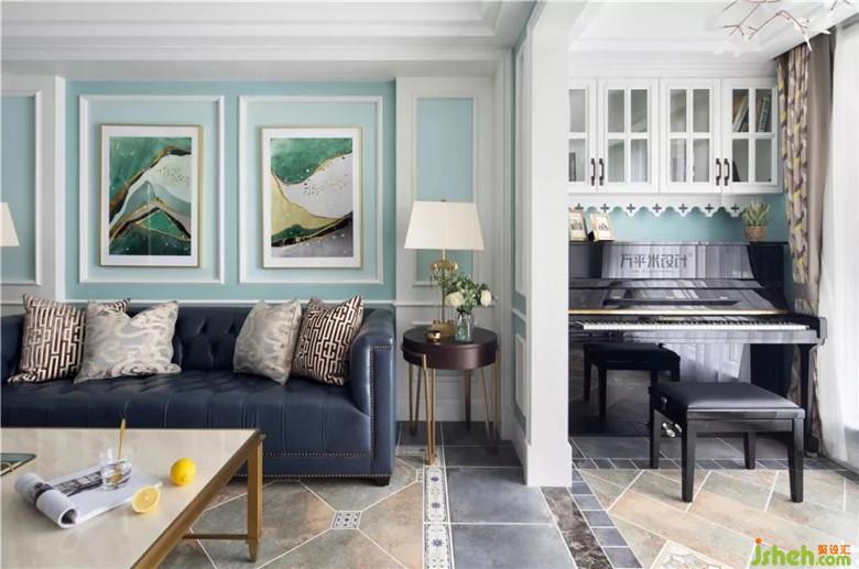 兩側(cè)木作造型將沙發(fā)主位內(nèi)嵌式設(shè)置,層次分明更具立體質(zhì)感。家是女主人的名片,她演奏的美妙樂(lè)曲,使這張色彩夢(mèng)幻的名片更添古典魅力??蛷d與陽(yáng)臺(tái)間的原始隔墻內(nèi)移后使陽(yáng)臺(tái)可放置鋼琴。鋼琴頂部吊柜增添收納。定制的灰白大理石馬賽克內(nèi)嵌于美式造型線框內(nèi),使大面積淺色觀影背景視感舒適亦有格調(diào)。