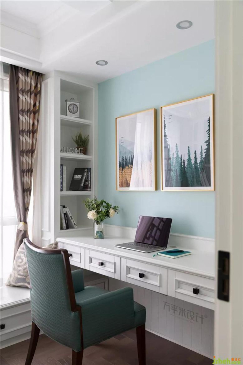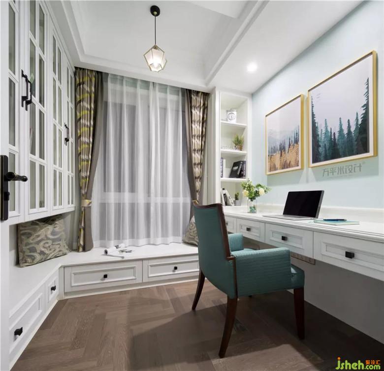將中庭與空中花園改為更具私密性的獨(dú)立書房,水紋玻璃房門將自然光線引入走廊區(qū)域。房間面積不大,為保證書桌區(qū)域的清爽,將開放式書柜設(shè)置在書桌兩側(cè)。書桌背側(cè)木質(zhì)擋板,便于清潔。L型一體地臺于左側(cè)書柜下方可置物,靠窗一側(cè)則是飄窗形式,可坐可臥。保持空間感的同時又具實用性。