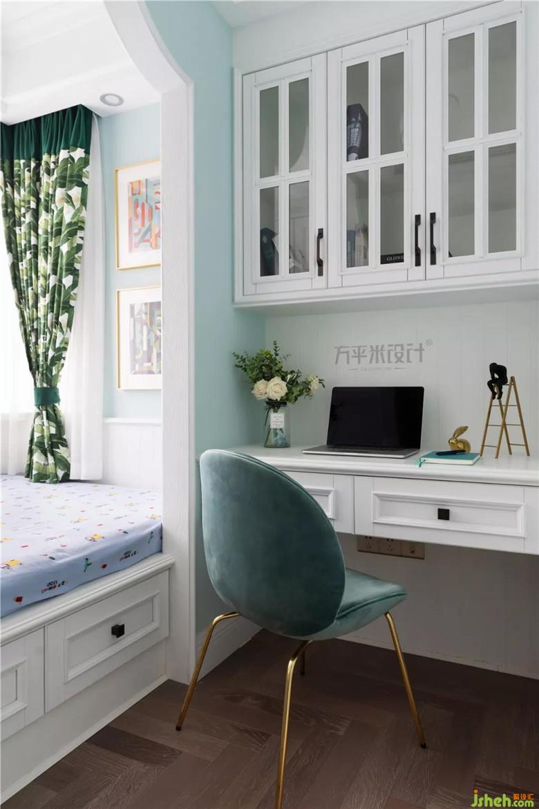 不足六平的兒童房,靠窗一側(cè)是L型采光窗,考慮難以常規(guī)放置成品家具,采用儲物式榻榻米與定制書桌的形式實現(xiàn)幾大功能。床尾一側(cè)為滿墻儲物柜成為收納空間。造型隔墻弧形門洞增加童趣,并讓床鋪區(qū)域略微圍鑲內(nèi)收。于靠床一側(cè)設(shè)置壁燈開關(guān)及安全插座。木質(zhì)護(hù)墻板便于打理。窗簾與掛畫色彩呼應(yīng)。