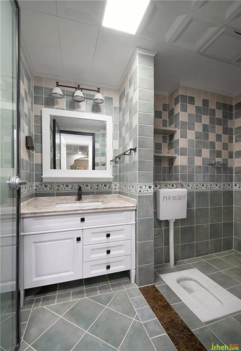 公衛(wèi)整體采用灰綠色仿古瓷磚,上半部分點(diǎn)綴暖色小磚,保證整體效果的同時(shí),又使空間更為生動(dòng)、自然。并利用保管位置制作大理石層板,為日后收納做好考慮。