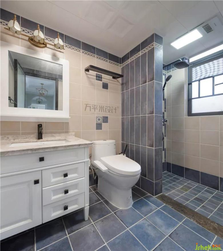 二層衛(wèi)生間,采用藍(lán)色與米色瓷磚進(jìn)行搭配,對比明顯,層次分明。采用半隔斷的方式將淋雨區(qū)與干區(qū)進(jìn)行分離,相對獨(dú)立而又協(xié)調(diào)統(tǒng)一。