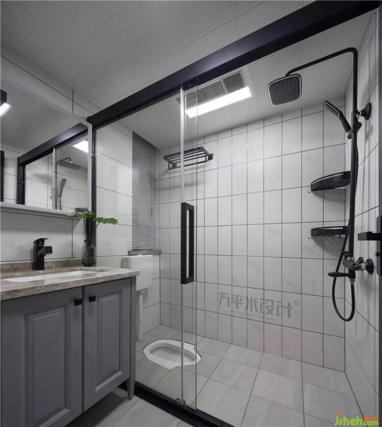 統(tǒng)一黑色啞光五金選擇,更為純粹。淋浴隔斷作出干濕分離,小空間也能功能明確。