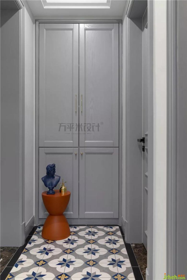 走廊處同樣選用門廳同款復(fù)古地磚進行呼應(yīng)。原主臥入口處走廊空間制作的兩組背對儲物柜,提升居住收納空間。