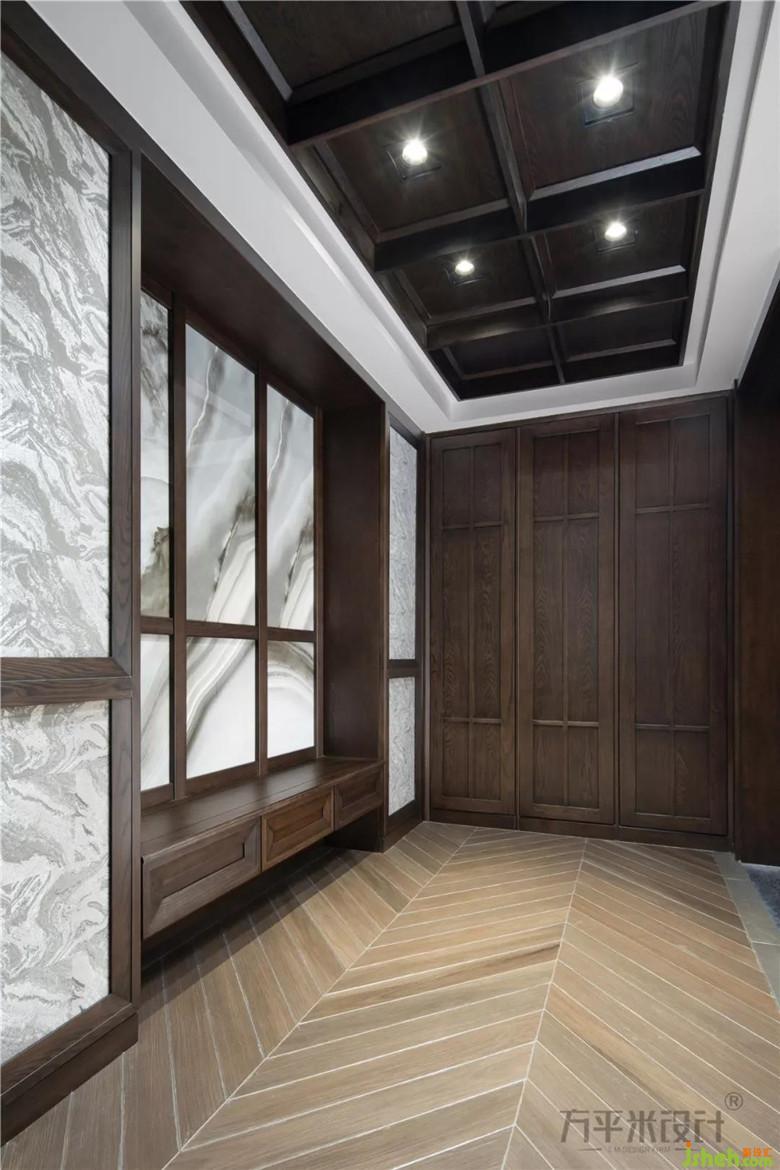 移步中廳則是寬敞的換鞋區(qū)域:有懸空的卡座設(shè)計于兩側(cè)的收納柜中,大背板與門廳處采用相同的紋理瓷片裝飾,光潔便于打理。作為入戶和主要公共起居空間的自然過渡,中廳處所使用的材質(zhì)及門型于全屋均有所呼應(yīng)?!?