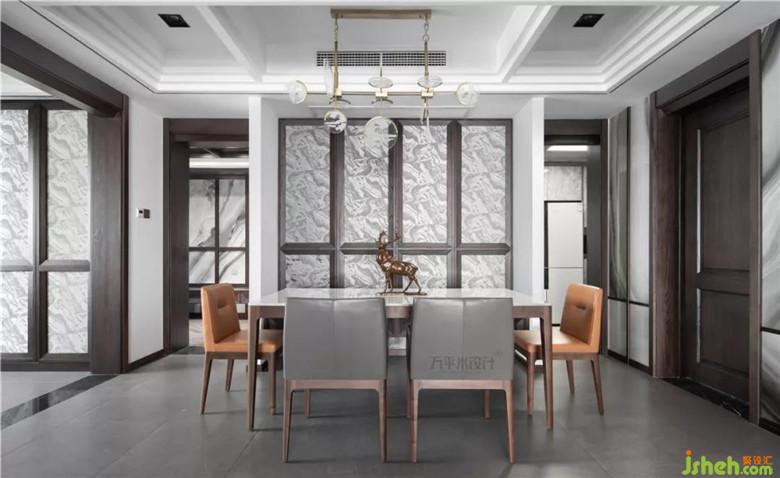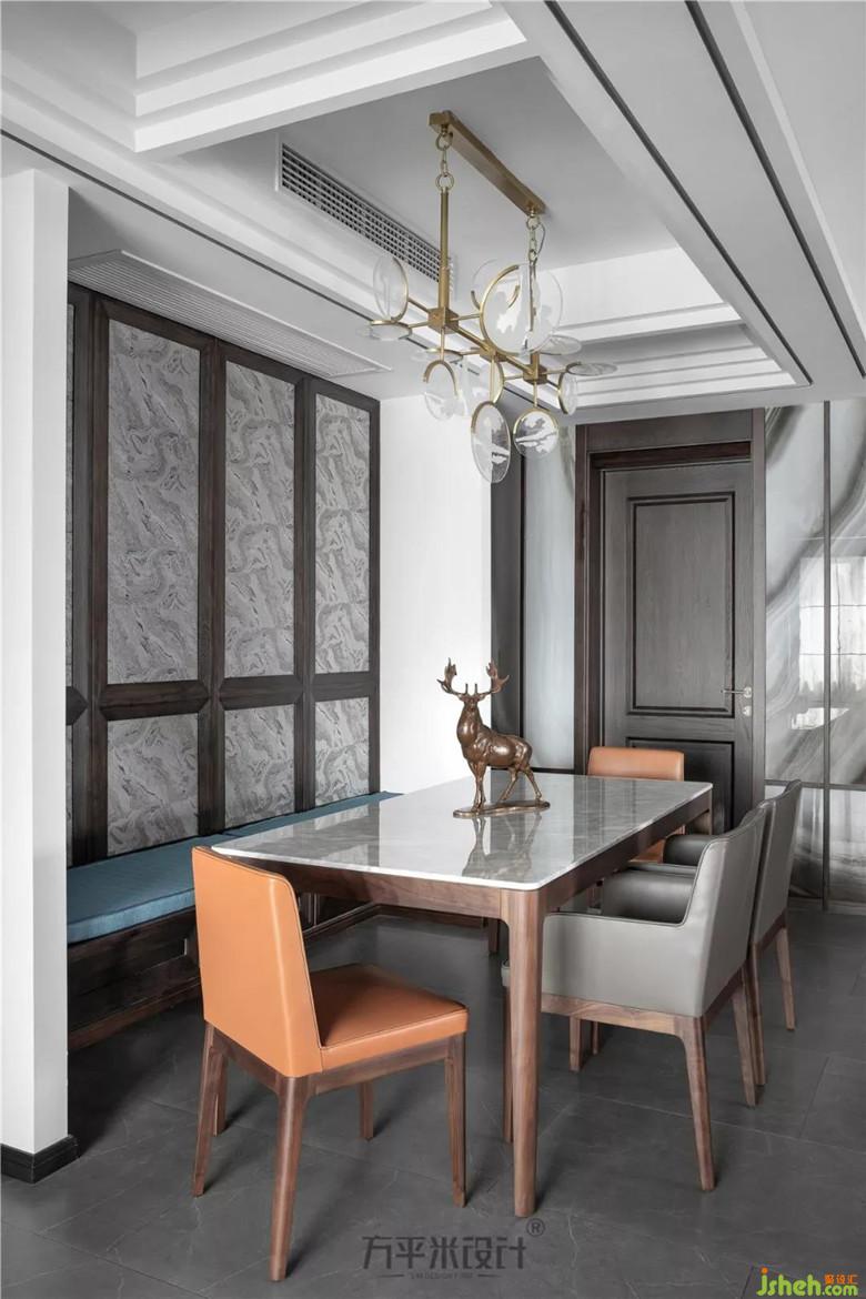 餐桌椅選用線條簡約的設(shè)計,餐臺光潔的雪花白大理石臺面于材質(zhì)及色澤上應(yīng)對墻面的硬裝用材。中廳及餐廳的層次分明,相鄰區(qū)域的對稱卡座互為呼應(yīng)。設(shè)計師特意設(shè)計的原木木框門型及低調(diào)咖色,搭配精選灰調(diào)云紋布樣,富有肌理。