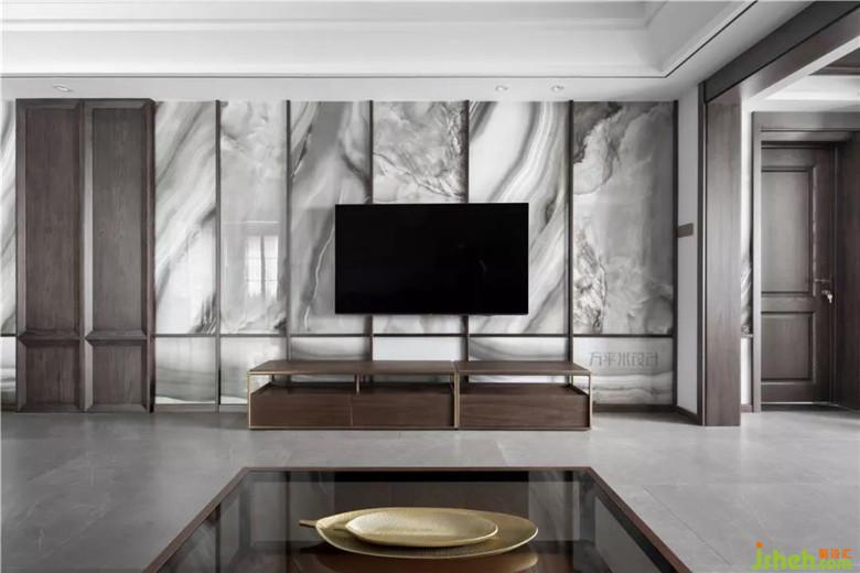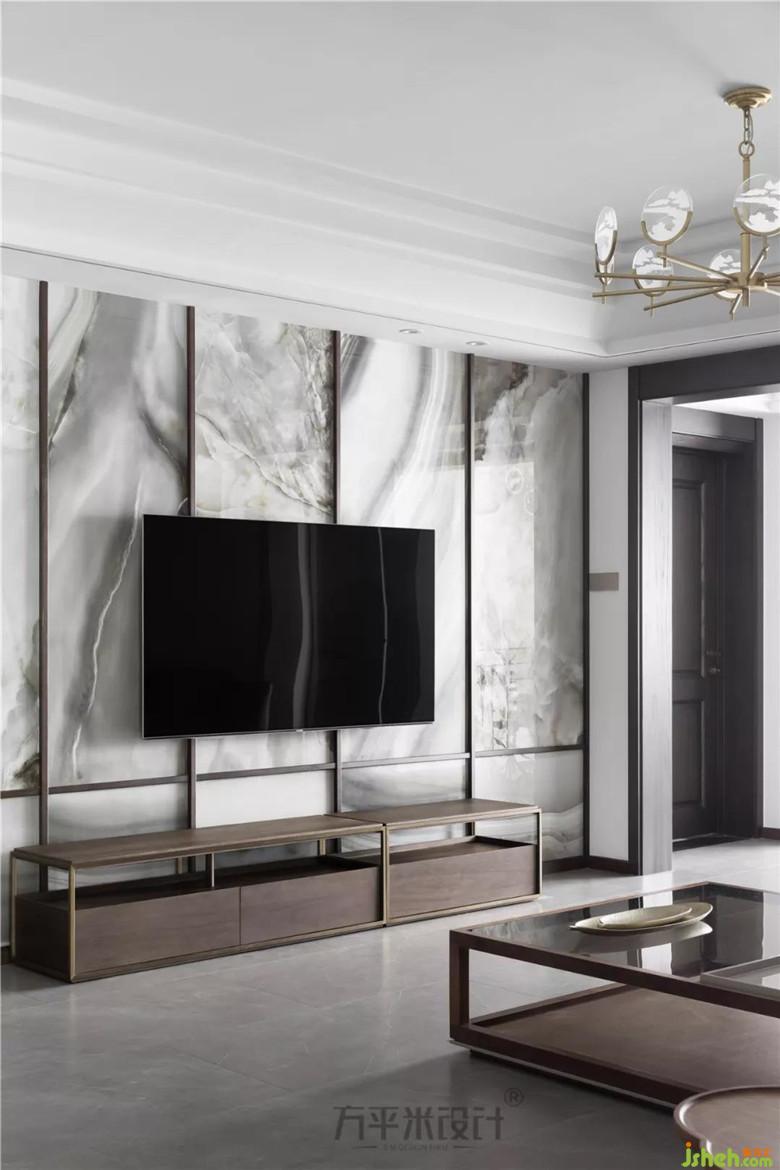 將云紋瓷片以考究比例內(nèi)嵌于窄邊框的原木線條內(nèi),令連貫的電視背景墻面似寫意山水,恢弘而生動。