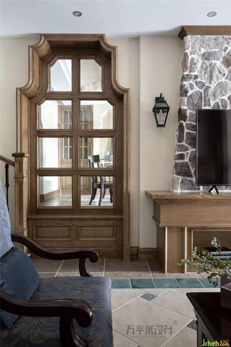 整個空間強(qiáng)調(diào)了對稱形式美學(xué),客廳區(qū)域下沉,地面形成了不同的維度的高差體驗(yàn)。電視背景墻將客餐廳分隔,為了讓空間得以交流,視覺更加通透,得以延伸,兩側(cè)墻體一面玻璃一面鏡子,一虛一實(shí),平衡輕重。采用富有自然肌理感的文化石進(jìn)行貼面,搭配黑色戶外鐵藝馬燈,從紋路到質(zhì)感都呈現(xiàn)出莊園式的復(fù)古情懷,詮釋了美式風(fēng)情的特點(diǎn)。