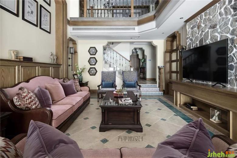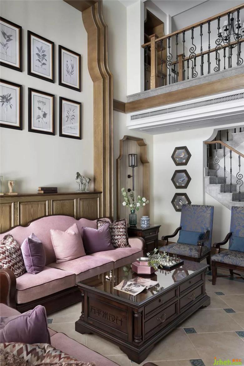 茱萸粉的古典沙發(fā),綴以略帶灰度的香芋紫,布藝和絨面交融的質(zhì)感,相互印襯。