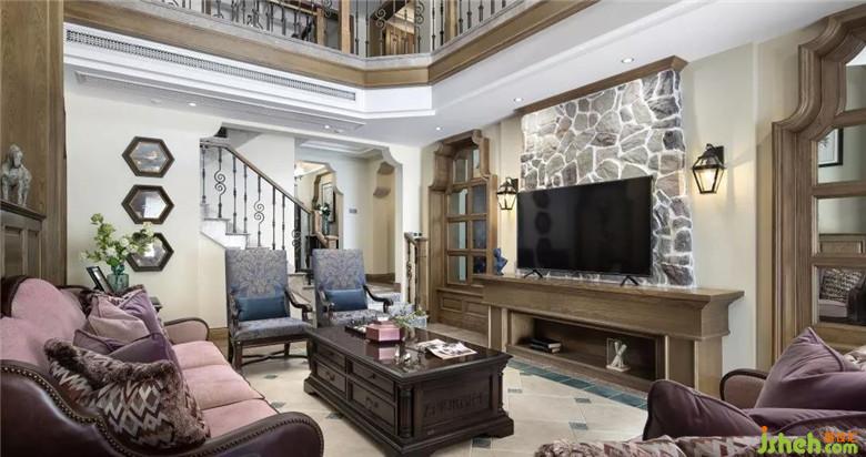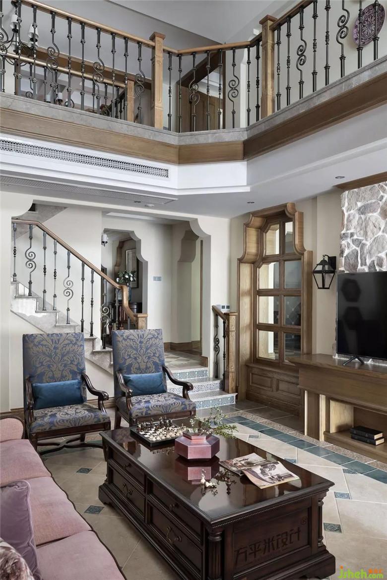 客廳頂面原為長方結(jié)構(gòu),為符合整體空間格調(diào),保證過道高度,設(shè)計師和施工人員現(xiàn)場不斷進(jìn)行推敲演算,最終確定吊頂角度和高度,形成既滿足整體布局又具風(fēng)格特色的風(fēng)化白米字形吊頂。