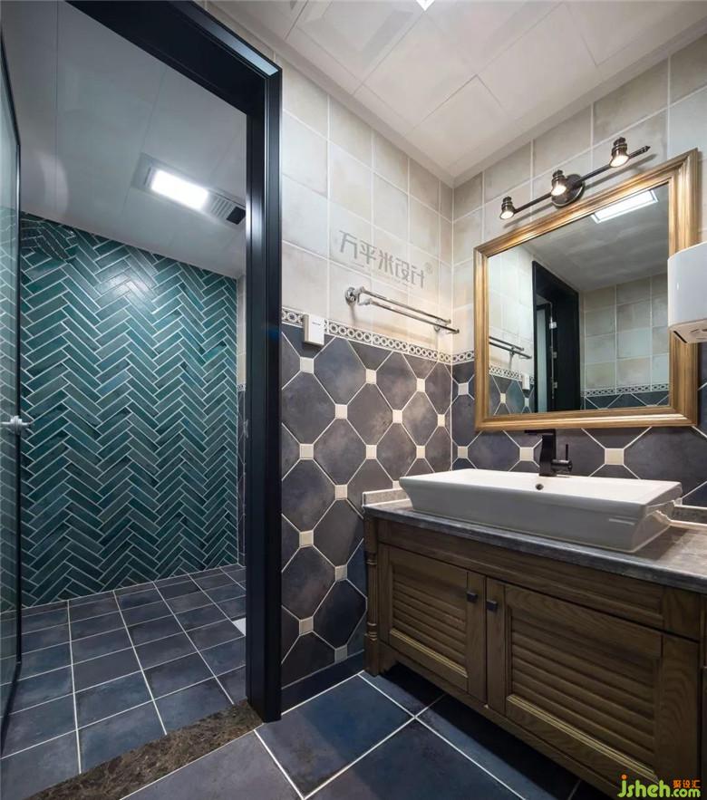 孔雀綠色墻磚采用魚(yú)骨拼貼法,映襯著地面的灰藍(lán)色,配合腰線上層的奶咖色墻磚。三種顏色之間的對(duì)比與搭配,層次分明,肌理有別的鋪面之間環(huán)環(huán)相應(yīng),讓空間極具張力,碰撞出別致有趣的美學(xué)體驗(yàn)。