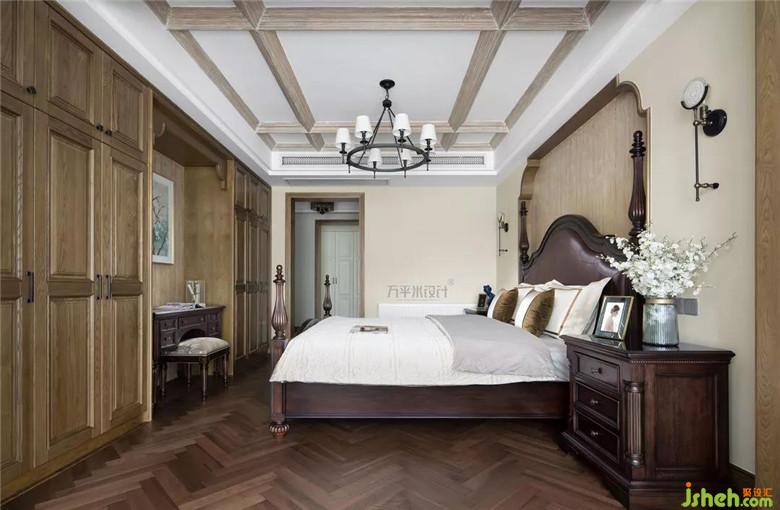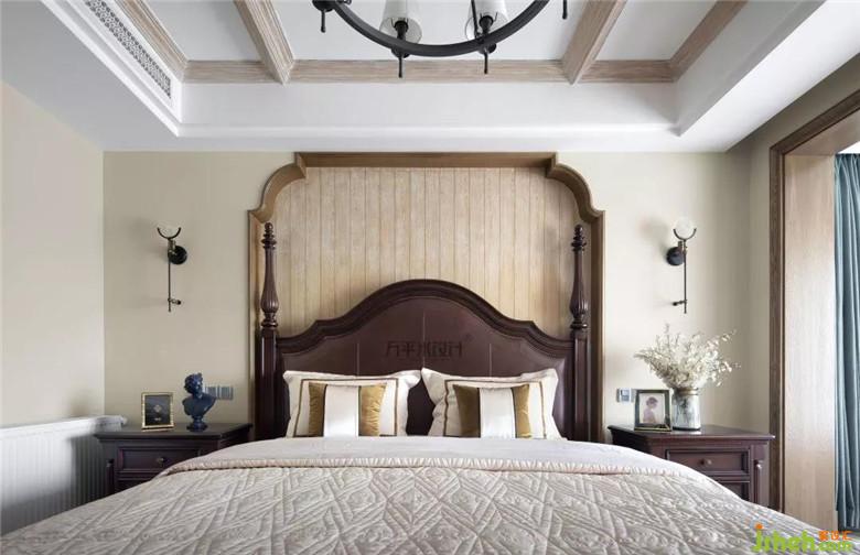 主臥以奶咖色墻漆與內(nèi)凹風(fēng)化白墻板造型結(jié)合,與頂面進行分割,床體嵌入的同時也增添了整體的層次感。主床選用了皮質(zhì)靠背沿以金屬鉚釘扣,搭配經(jīng)典的美式木質(zhì)邊框。床線條勾勒細節(jié),木質(zhì)結(jié)構(gòu)穩(wěn)重舒適,帶著典雅莊重氣質(zhì),加上全房實木地板魚骨拼貼,形成傳統(tǒng)美式復(fù)古的圍合。
