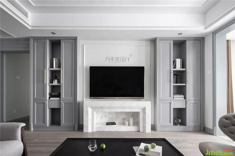 電視兩側(cè)對(duì)稱(chēng)式布局的儲(chǔ)物柜,在顏色、材質(zhì)及尺寸上,與空間中其它墻面造型形成連續(xù)性的整體。