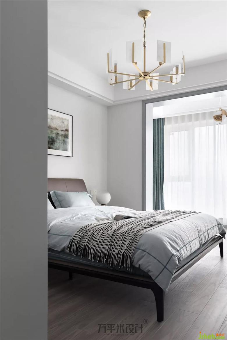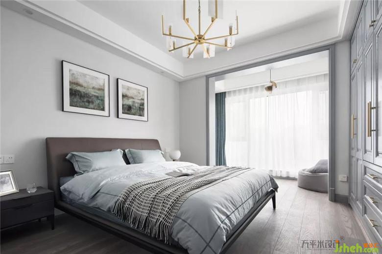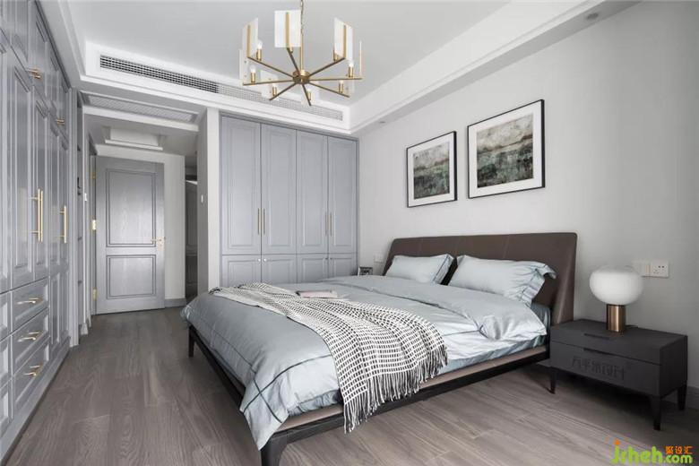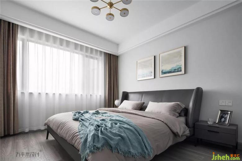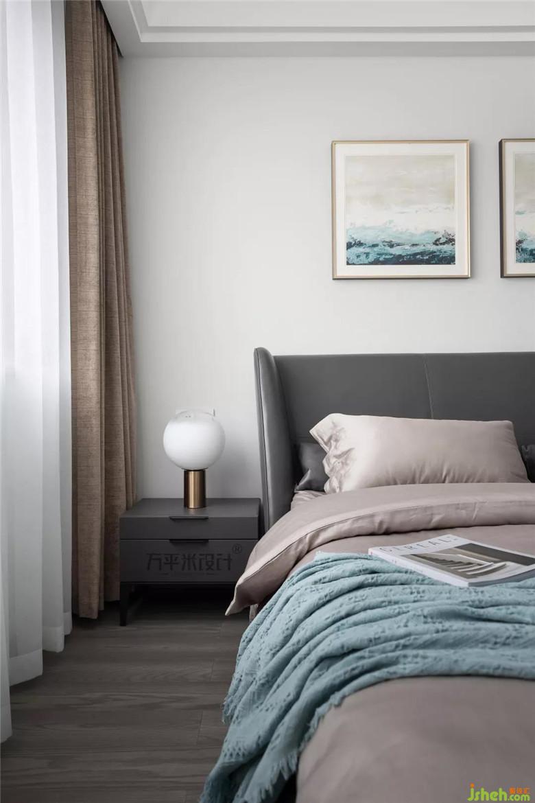 父母房軟裝裝修公司選配的顏色更為沉穩(wěn):棕色窗簾、深色床體及床頭柜、藕灰色床品,這樣較深沉的顏色更適宜父母的視覺感受體驗。