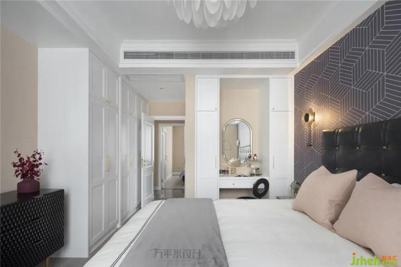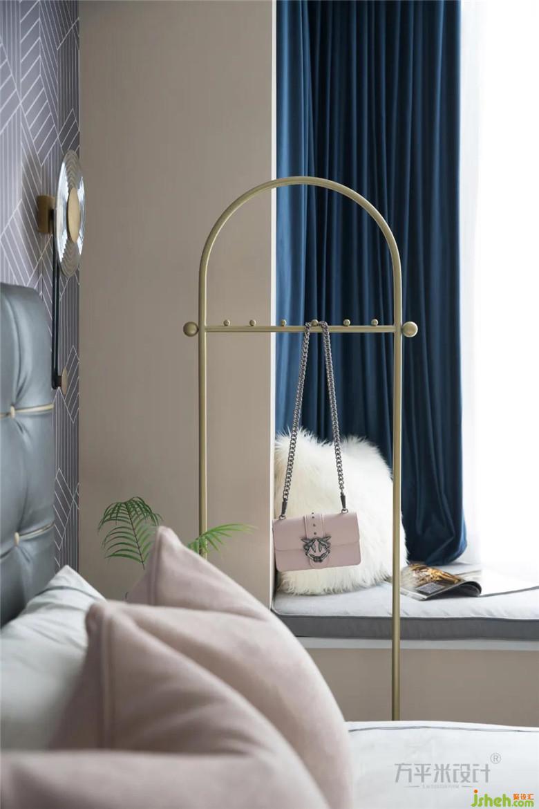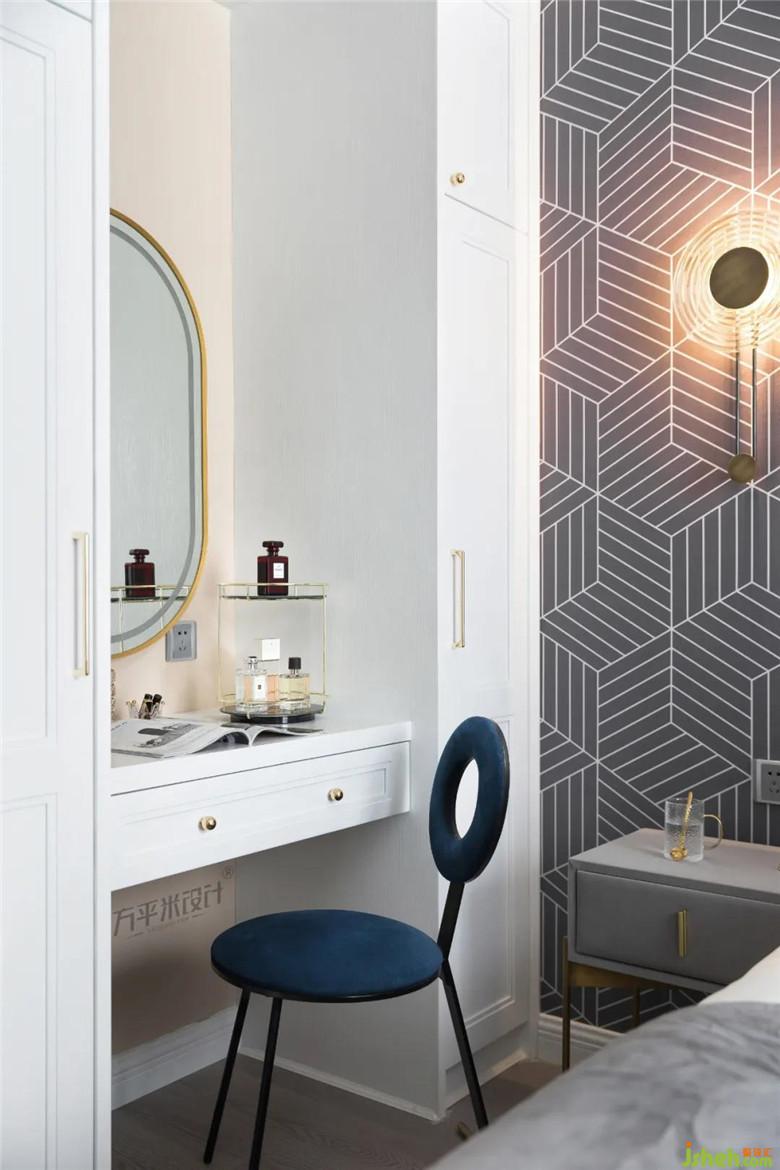 將梳妝臺(tái)與衣柜融為一體,與一側(cè)飄窗造型形成對應(yīng)關(guān)系,延伸空間視覺感。
