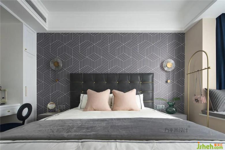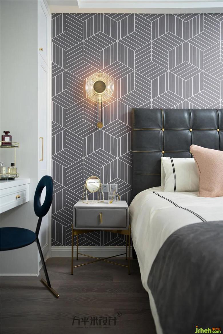 主臥中植入硬朗派的幾何線條墻布及深色系軟裝,打破以莫蘭迪粉為主的色調(diào)。在不同的色彩碰撞中,有了更鮮明的視覺呈現(xiàn),帶出沉穩(wěn)且溫馨的居家氣息。
