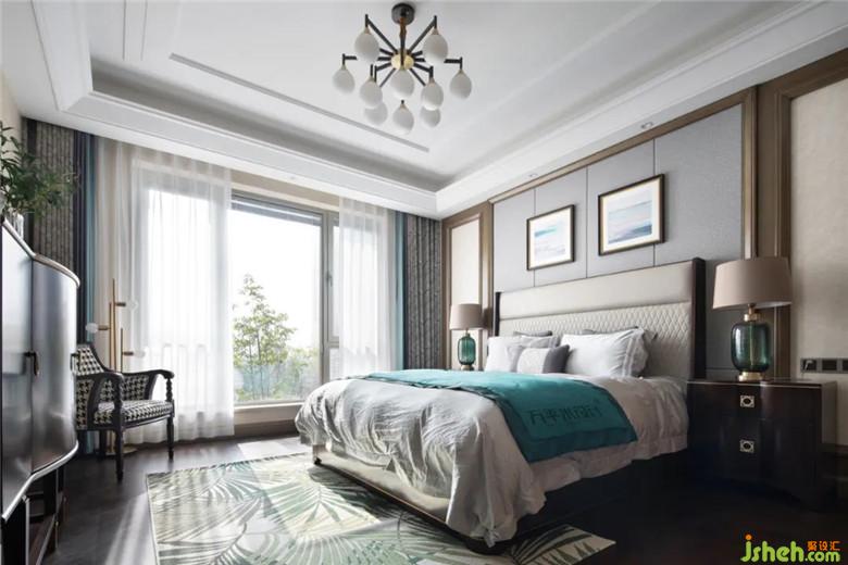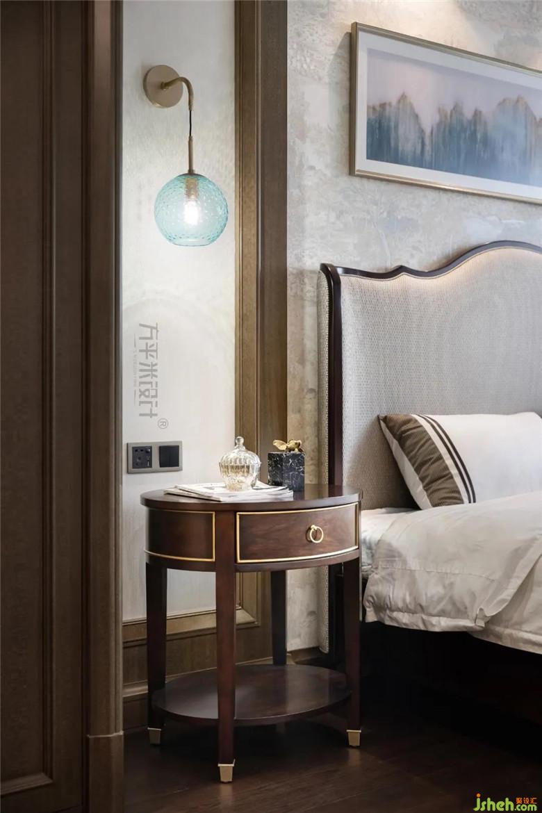在燈飾的選擇上,以魔豆燈為空間提供整體的均勻照明,一側(cè)墨綠床頭燈則對(duì)一些重點(diǎn)區(qū)域單獨(dú)投光,靠近窗戶的金屬落地?zé)糁饕鸬窖b飾作用,豐富整體空間層次。