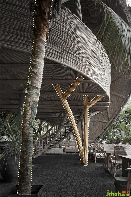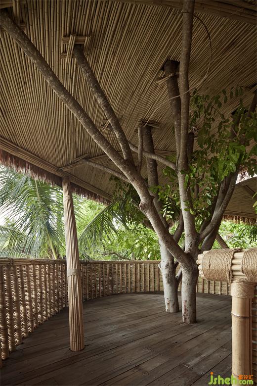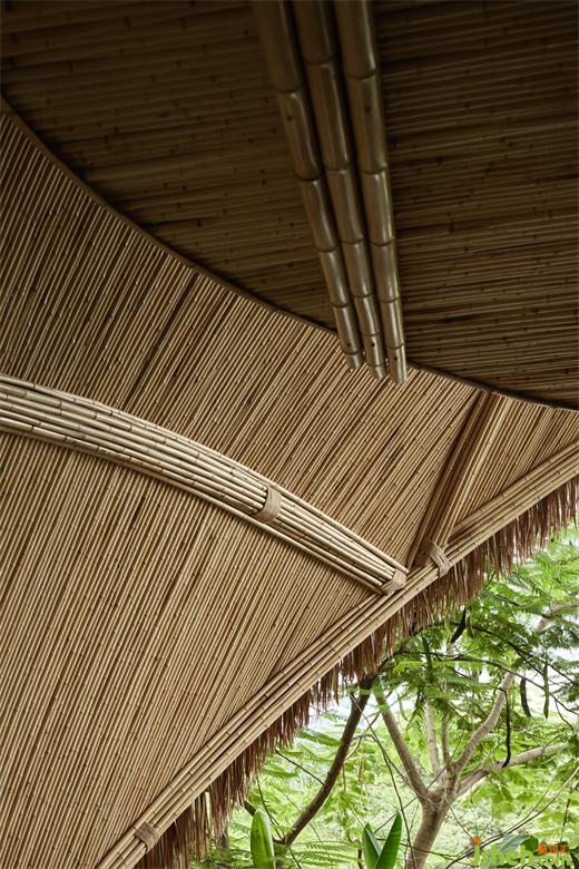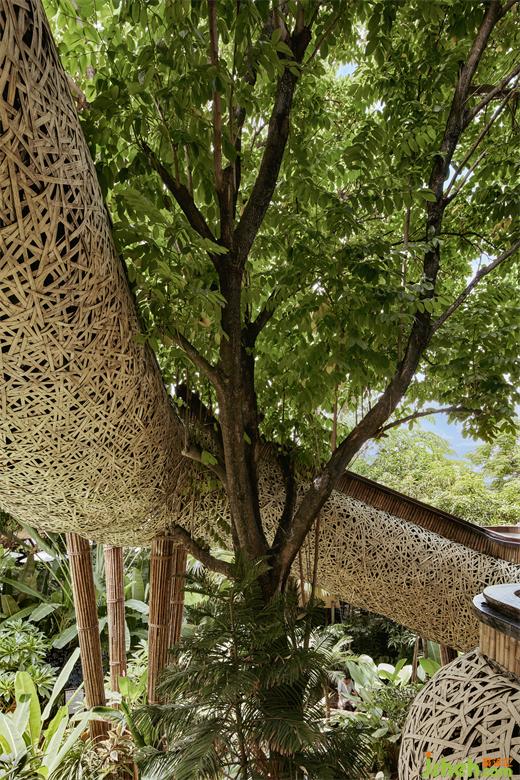 在樓梯外的延伸空間,我們選擇采用版納傳統(tǒng)的竹編古法技藝,會所設(shè)計為這個空間創(chuàng)造了一種與自然深度連接的機(jī)會,仿佛將內(nèi)外世界融為一體。這里不僅有獨(dú)特的觀景體驗,還有自然的治愈力量。
