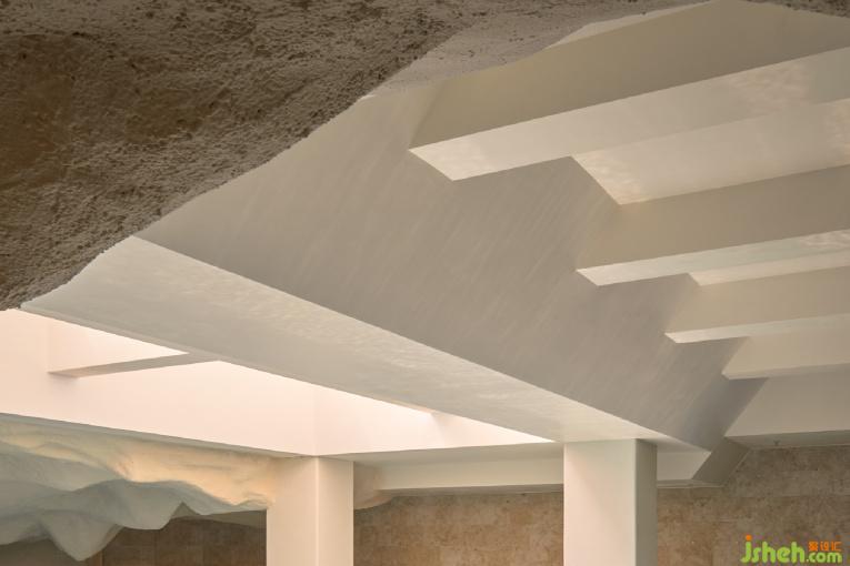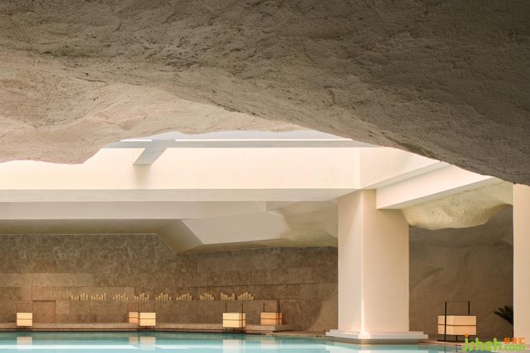 酒店設(shè)計(jì)泳池區(qū)域設(shè)計(jì)靈感源自對(duì)一片神秘地下源泉的發(fā)現(xiàn),暗流涌動(dòng)的地下溫泉傳說會(huì)勾起每一顆因好奇而去探索的心。頂部的曲線與高低起伏,塑造出如天然溶洞一般的壯觀奇景。