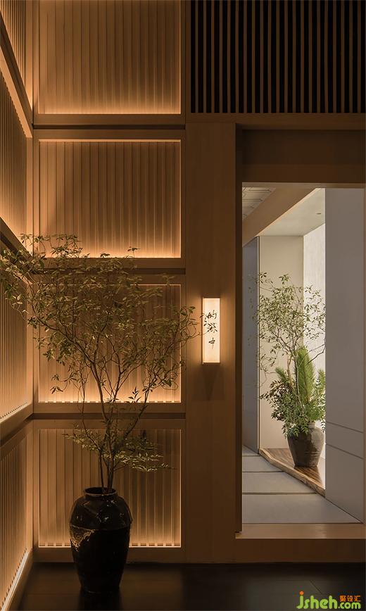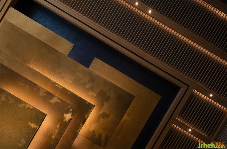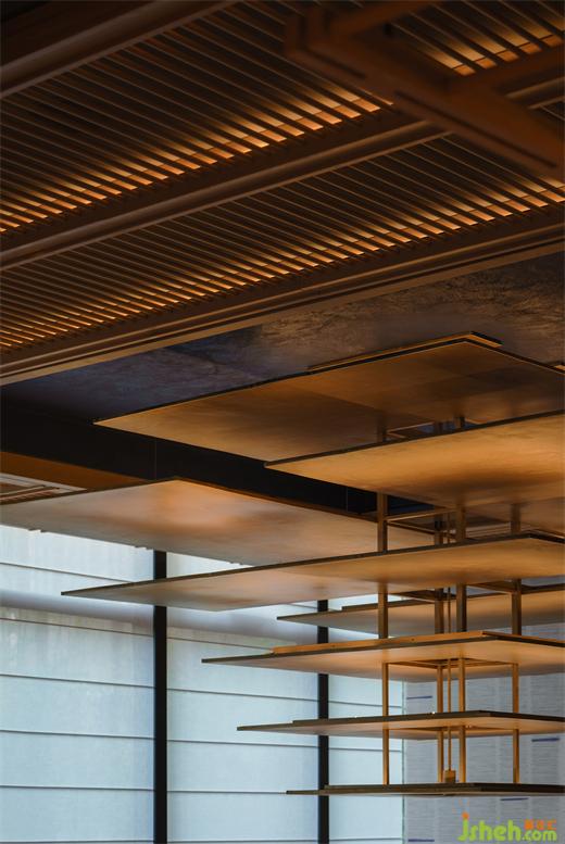 食客穿行至開闊的大堂之處,從天花上懸掛下來的金色裝置映入眼簾,仿佛如初見水中倒映的金閣寺一般。裝置來自京都傳統(tǒng)的鍛金工藝精心制作而成,自然的紋理賦予了其古樸的質(zhì)地,又非一味的文化符號挪用,僅以簡約的線條抽象描摹,強調(diào)出現(xiàn)代性的輪廓感,寥寥數(shù)筆就將這靜謐與遁世離俗的氣質(zhì)渲染,仿佛有來自原野的風、搖曳的枝葉和濕潤苔蘚的氣息都剎那間涌了進來。