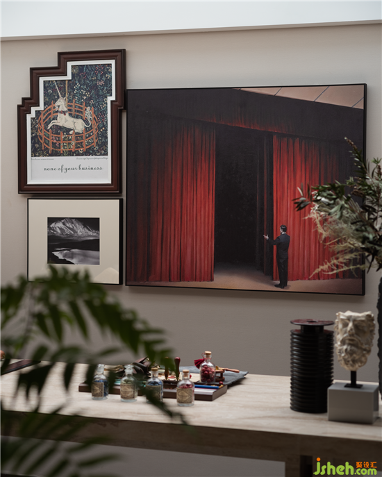 “藝術(shù)是一種享受,一切享受中最迷人的享受。”客廳的藝術(shù)掛畫與玄關(guān)金屬裝飾遙相呼應(yīng),虛與實的碰撞帶來強(qiáng)烈的視覺沖擊力。
