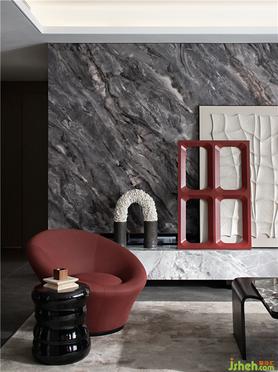 石材木飾的自然肌理,抽象的手工地毯,自由無序的藝術擺件,圍合出優(yōu)雅專注的情感交流空間。