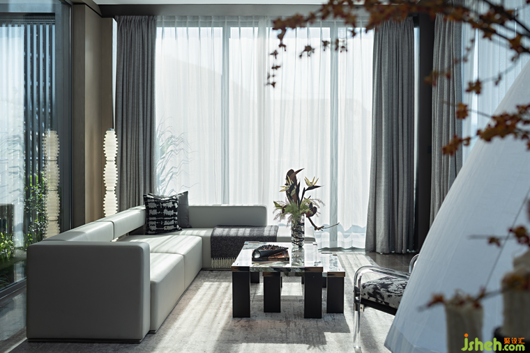 樣板間設(shè)計(jì)師以自然而然的手法,構(gòu)筑一個(gè)舒適與開放的共享客廳空間。巨大的落地窗將室外景色