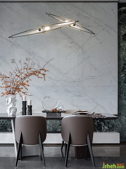 大尺度的天然石材氛圍鋪陳了空間的紋理,通透而舒展;梭形吊燈相互交融的玻璃與光線,