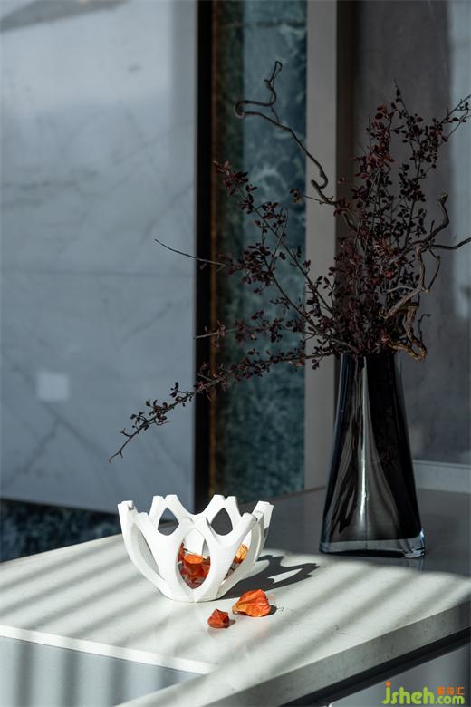 空間以簡潔的線條勾勒,皮藝沙發(fā)的優(yōu)雅、天然石材的隨性、花藝裝置的靈動(dòng),隨著光影的