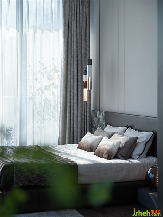 簾影斑駁,搖曳生輝,沒有過多的色彩渲染,營造一種更為寧靜的柔和氛圍。床背的自然肌理與床品、藝術(shù)吊燈相呼應(yīng),平衡主臥空間的同時(shí),于細(xì)節(jié)處增加主臥空間的質(zhì)感。